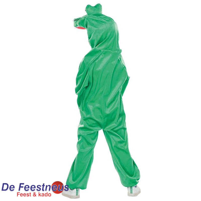 Groene jumpsuit met capuchon met een witte inzet op de voorkant. Een drakenhoofd met een gewatteerde snuit, grote ogen en een rij tanden is aan de kap bevestigd.
