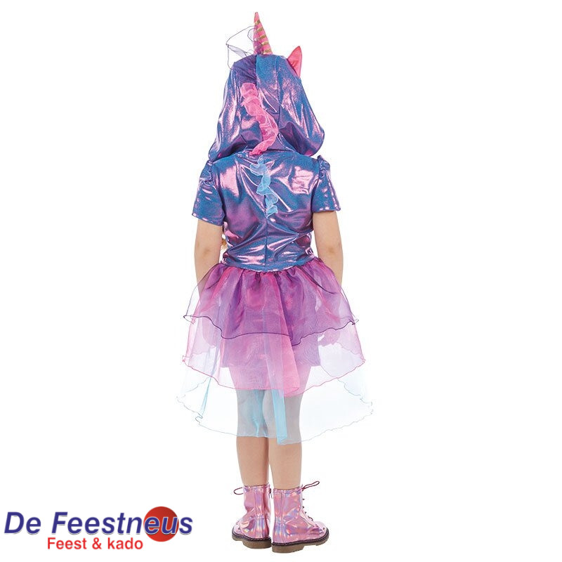 Hooded jurk in paars-glinsterende glanzende stof met een roze pluche inzetstuk. Bevestigd aan de taille is een peplum gemaakt van verschillende gekleurde tule lagen. Op de kap zitten oren en een hoorn bevestigd.