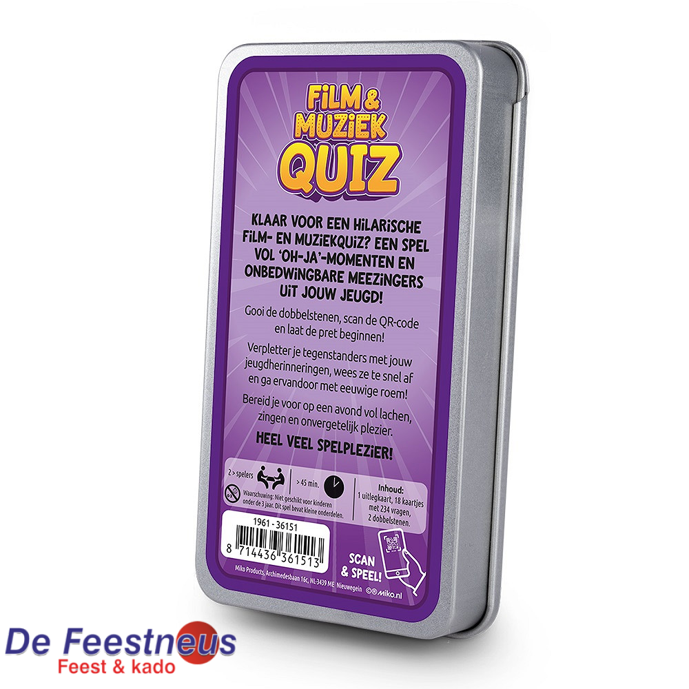 Elk spel bevat 19 kaartjes en 2 dobbelstenen in een blikje met een luxe schuifbare deksel. Met in totaal 234 vragen per spel is het een uitdagende en vermakelijke ervaring die zeker niet na 1 keer spelen verveelt.