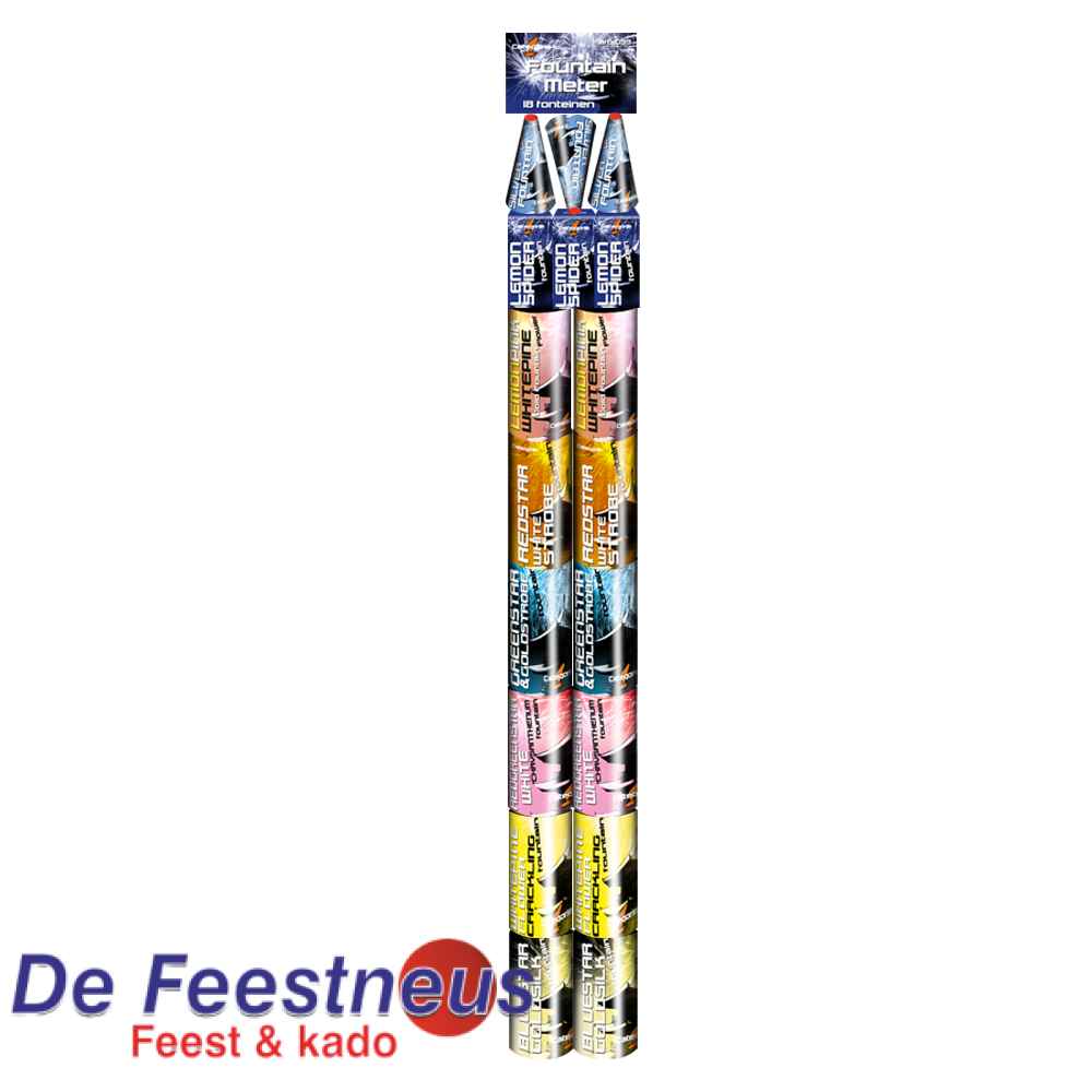 Fountain Meter, een meterpakket assortiment met geweldig sierlijke Categorie1-fonteinen. In dit assortiment zitten 18 fonteinen met verschillende siereffecten. 3 stuks Silver-kegel fonteinen, 1 stuk Lemon-Spider fontein, 2 stuks Redstar-Whitestrobe fonteinen, 2 stuks Greenstar-Goldstrobe fonteinen, 2 stuks Red-Greenstar fonteinen, 2 stuks Whistpine-Flower fonteinen en 2 stuks Bluestar-Goldsilk fonteinen.