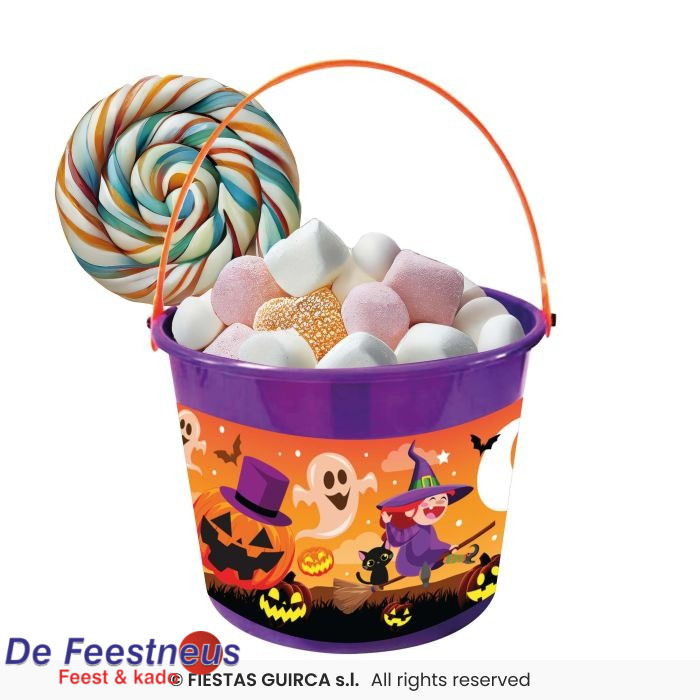 Halloween Pompoen trick or treat snoep emmertje paars, met heksen thema print. Ga langs de deuren in stijl en haal snoepjes op met dit schattige emmertje! Ook leuk om te gebruiken met Sint Maarten. Materiaal: polyester. Halloween snoep ophalen tasjes en emmertjes.