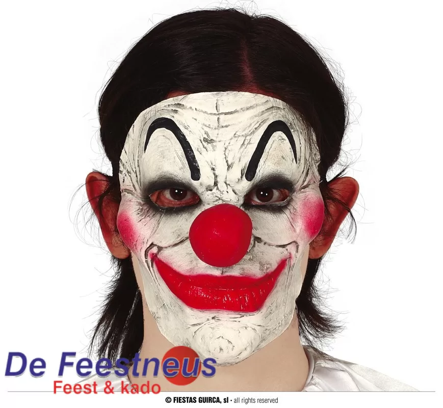 Latex masker van een klassiek Clown gezicht, wit gezicht, grote rode mond en wenkbrauwpotlood