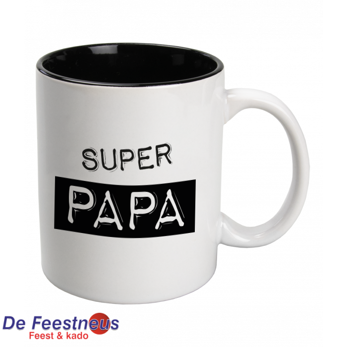 Deze mok met de tekst “Super papa” is een ideaal cadeau voor de speciale vader in je leven. Of het nu voor zijn verjaardag, Vaderdag of zomaar is, deze mok zorgt gegarandeerd voor een glimlach. De mok heeft een stijlvolle witte buitenkant en een zwarte binnenkant, wat zorgt voor een mooi contrast en een moderne uitstraling. Het ontwerp met de tekst “Super papa” maakt het een persoonlijke en hartverwarmende keuze om je liefde en waardering voor je vader te tonen.