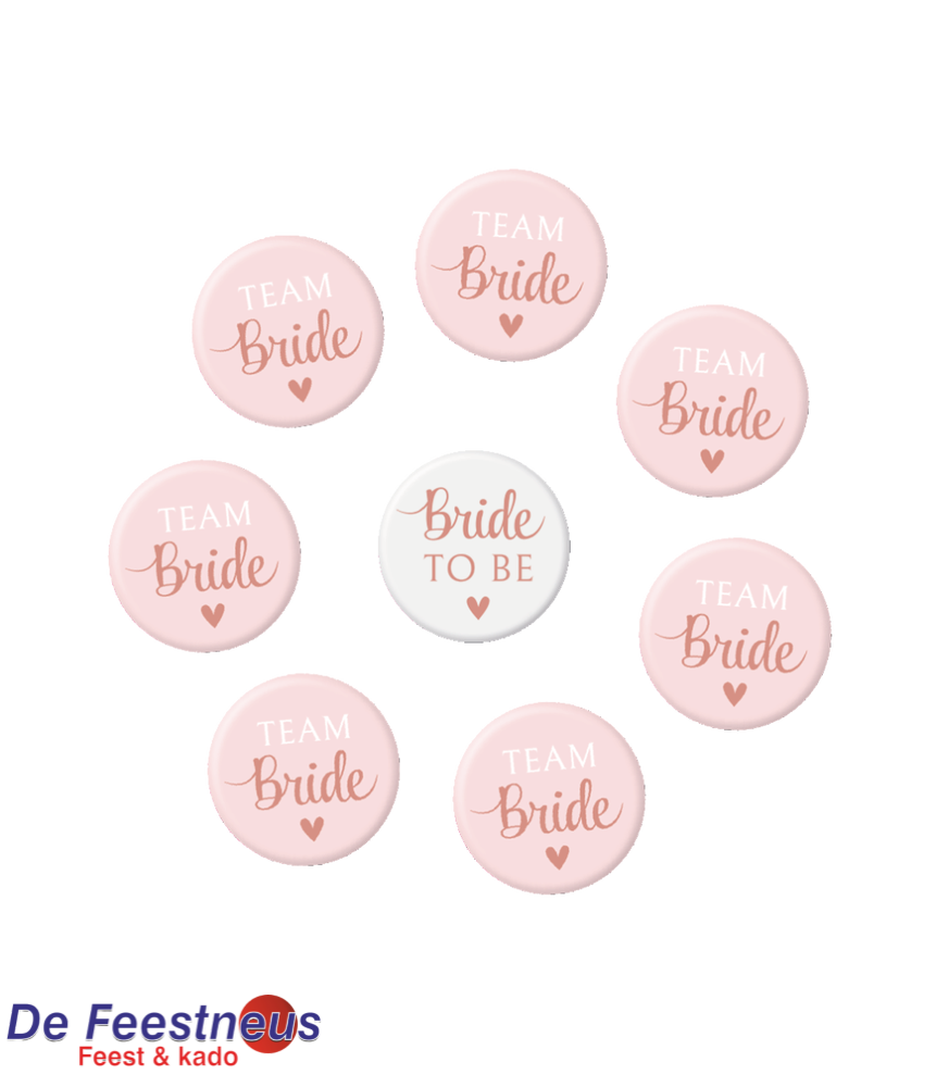 Deze Mini Badges – Bride to Be zijn feestelijke accessoires voor een vrijgezellenfeest of bridal shower. De set bestaat uit 8 buttons: 7 badges met de tekst ‘Team Bride’ en 1 badge met ‘Bride to Be’. Zo kunnen zowel de aanstaande bruid als haar gezelschap eenvoudig herkenbaar deelnemen aan het feest. De compacte badges zijn licht van gewicht en eenvoudig op kleding te spelden. Dankzij het duidelijke ontwerp vormen ze een leuke aanvulling op het assortiment vrijgezellenfeestartikelen en combineren ze goed met sashes, diademen en andere Bride to Be accessoires uit dezelfde lijn.