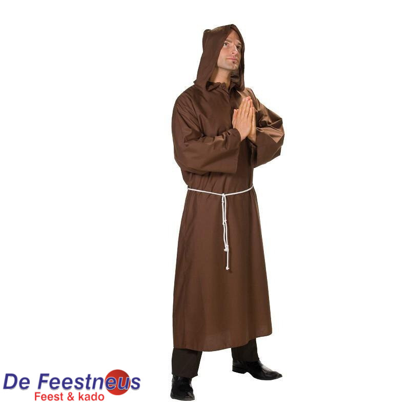 Klassiek bruin gewaad met capuchon met witte koordriem.