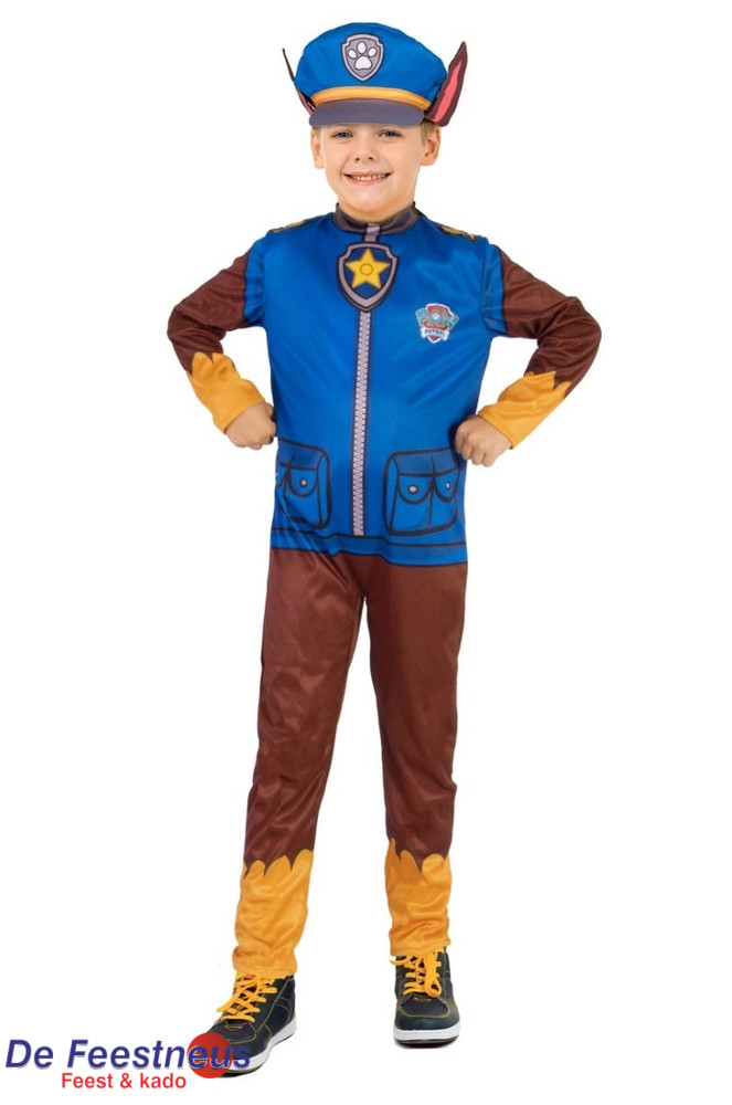 Dit Chase kostuum bestaat uit een jumpsuit en hoofddeksel. Het pak is bruin met beige randen aan de benen en armen. De top is blauw van kleur en heeft kuifopdrukken, imitatie zakken en een ritssluiting die lijkt op het uniform van Chase, de beroemde PAW Patrol agent. Kinderen kunnen de beroemde PAW Patrol politieagent spelen met dit Chase kostuum voor Carnaval of op een verjaardag!