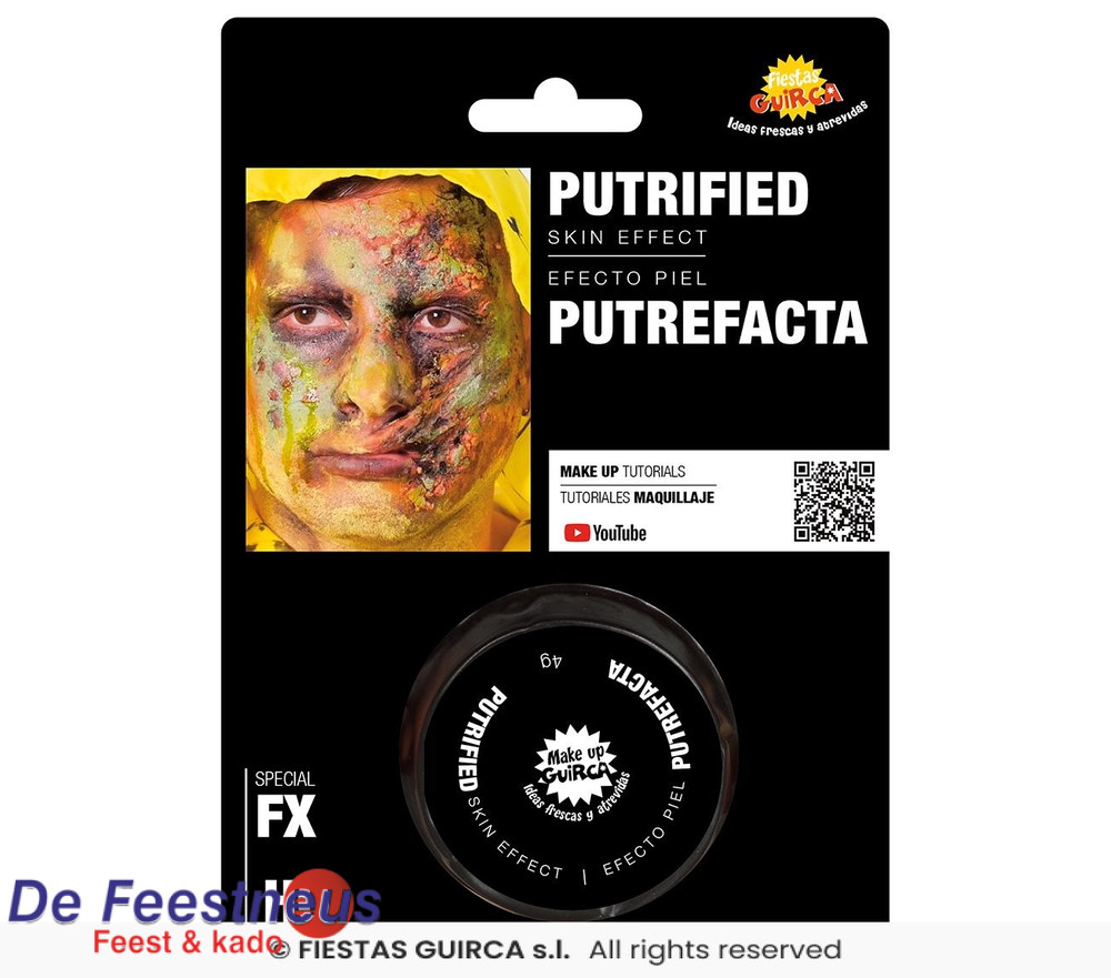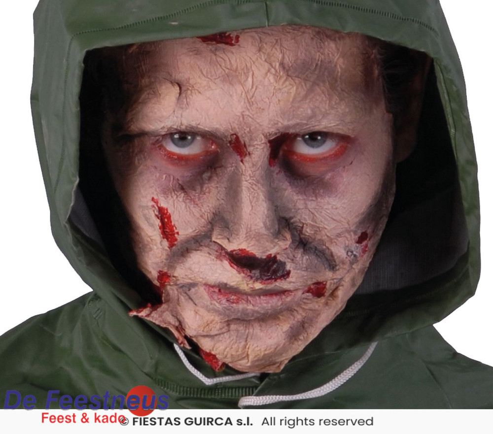 Het effect van deze schmink is bedoeld om de huid er verrot, geïnfecteerd of vergaan uit te laten zien — ideaal voor een zombie-, infectie- of rotte huid-look bij Halloween of horror-make-up.