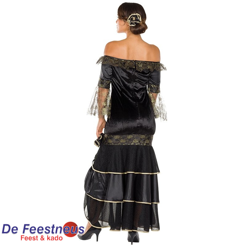 Lange zwarte flamenco jurk gemaakt van verschillende stoffen. Gouden kanten rand versiert de halslijn, de korte mouwen en de druppel taille. De bovenkant is versierd met kleine gouden studs. De volant van de rok is gerand met een gouden rand. Jurk en barrette zijn versierd met zwarte bloemen.