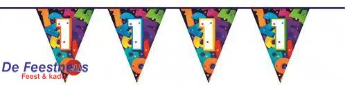 De vlaggenlijn met cijfers en de leeftijd 1 jaar is perfect voor het vieren van een speciale verjaardag! Deze kleurrijke vlaggenlijn is speciaal ontworpen met cijfers om de mijlpaal van het eerste levensjaar te markeren. Met een lengte van 10 meter kan deze vlaggenlijn gemakkelijk worden opgehangen in feestruimtes, tuinen of andere locaties om de feestvreugde te vergroten. De vlaggenlijn is geschikt voor binnen en buiten.