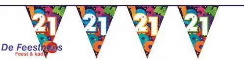 De vlaggenlijn met cijfers en de leeftijd 21 jaar is perfect voor het vieren van een speciale verjaardag! Deze kleurrijke vlaggenlijn is speciaal ontworpen met cijfers om de mijlpaal van het eenentwintigste levensjaar te markeren. Met een lengte van 10 meter kan deze vlaggenlijn gemakkelijk worden opgehangen in feestruimtes, tuinen of andere locaties om de feestvreugde te vergroten. De vlaggenlijn is geschikt voor binnen en buiten.