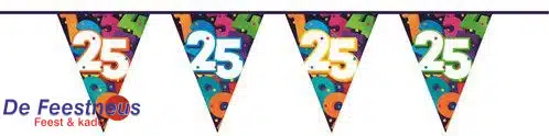 De vlaggenlijn met cijfers en de leeftijd 25 jaar is perfect voor het vieren van een speciale verjaardag! Deze kleurrijke vlaggenlijn is speciaal ontworpen met cijfers om de mijlpaal van het vijfentwintigste levensjaar te markeren. Met een lengte van 10 meter kan deze vlaggenlijn gemakkelijk worden opgehangen in feestruimtes, tuinen of andere locaties om de feestvreugde te vergroten. De vlaggenlijn is geschikt voor binnen en buiten.