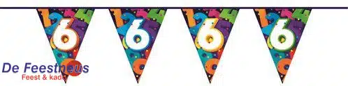 De vlaggenlijn met cijfers en de leeftijd 6 jaar is perfect voor het vieren van een speciale verjaardag! Deze kleurrijke vlaggenlijn is speciaal ontworpen met cijfers om de mijlpaal van het zesde levensjaar te markeren. Met een lengte van 10 meter kan deze vlaggenlijn gemakkelijk worden opgehangen in feestruimtes, tuinen of andere locaties om de feestvreugde te vergroten. De vlaggenlijn is geschikt voor binnen en buiten.