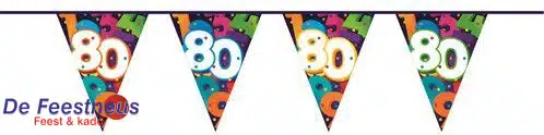 De vlaggenlijn met cijfers en de leeftijd 80 jaar is perfect voor het vieren van een speciale verjaardag! Deze kleurrijke vlaggenlijn is speciaal ontworpen met cijfers om de mijlpaal van het eenentwintigste levensjaar te markeren. Met een lengte van 10 meter kan deze vlaggenlijn gemakkelijk worden opgehangen in feestruimtes, tuinen of andere locaties om de feestvreugde te vergroten. De vlaggenlijn is geschikt voor binnen en buiten.