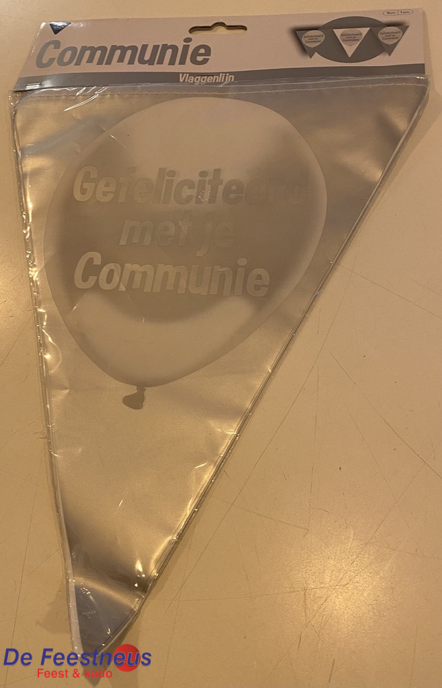 Een zilver/witte vlaggenlijn voor je 1e communie en is 6 meter lang
